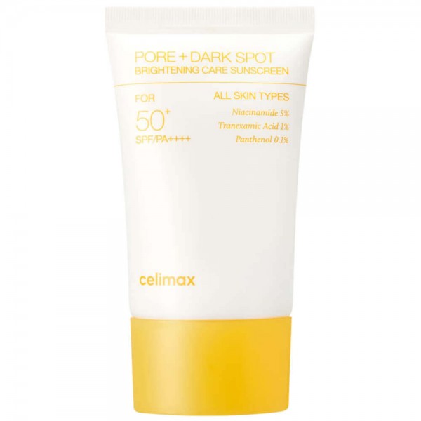 Крем Celimax Pore+Dark Spot Brightening Care Sunscreen SPF50+ PA++++ сочетает в себе защиту от ультрафиолета и средство от пигментации.